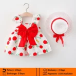 Make your little girl look extra adorable with this charming cherry print baby dress set. Designed with a big bow and matching hat, this outfit is perfect for parties, photoshoots and special occasions.