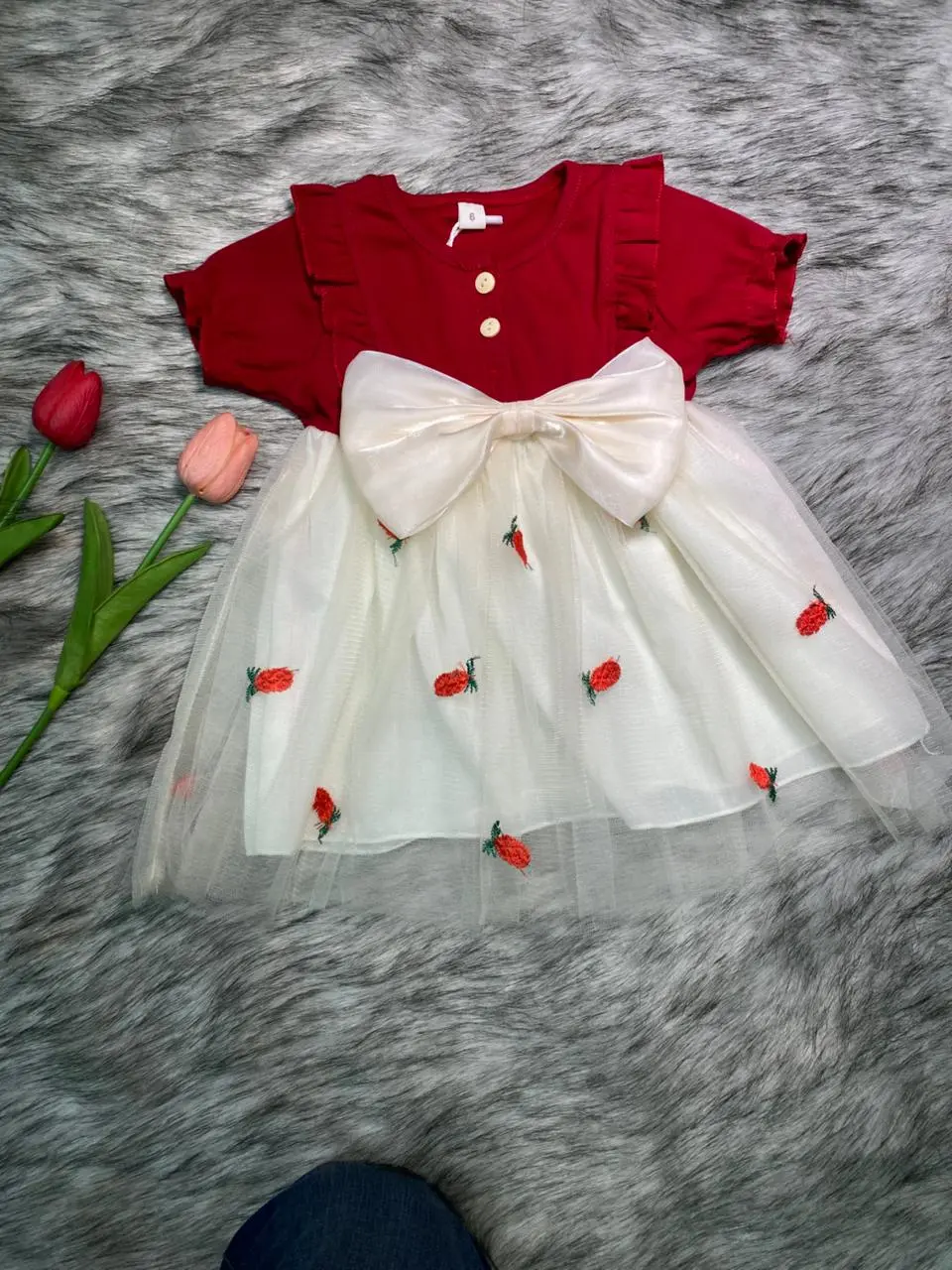 স্কার্ট অংশে ছোট ছোট লাল স্টোবেরি ফ্লাওয়ার প্রিন্ট